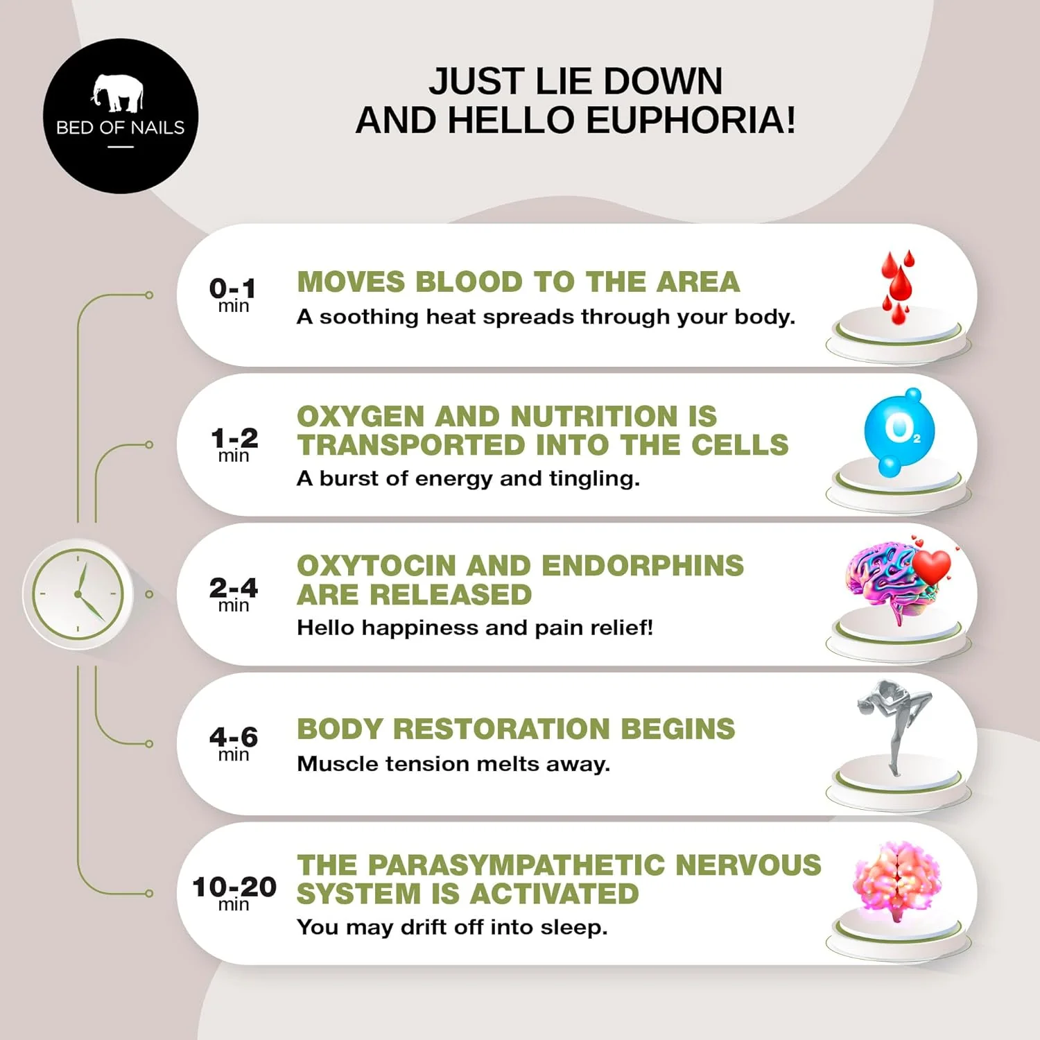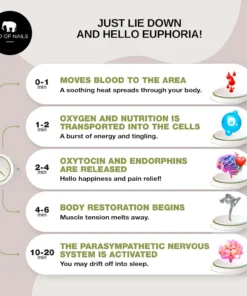 - 1 – 2 min: Due to the thousands of nails, the blood circulation increases through your body. A soothing heat spreads through your body.